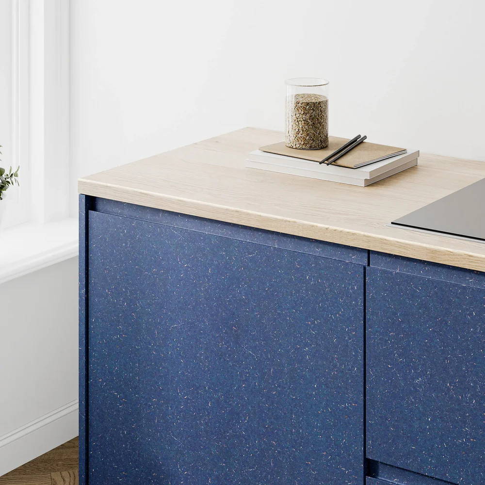 Thickness 22 mm. The base is made of moisture-resistant chipboard with oak edges on all visible sides, and the surface itself is covered with natural organic linoleum, which is glued to a strong adhesive under high pressure to ensure increased reliability.