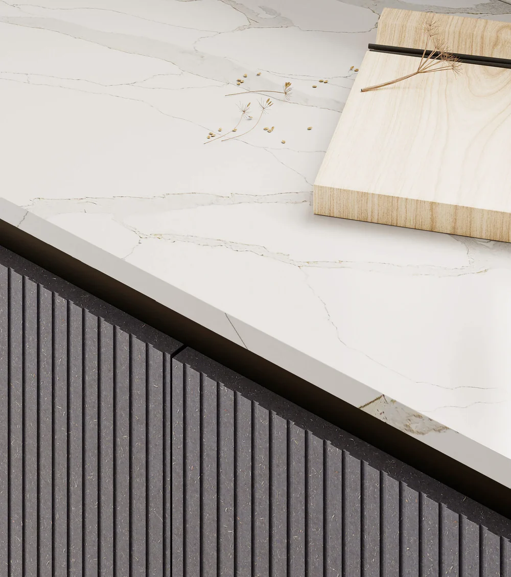 Quartz countertops have a smooth, glossy surface. Quartz is durable, resistant to wear and scratches, moisture-resistant, heat-resistant and stable. It can be used with countertop and undermount sinks.