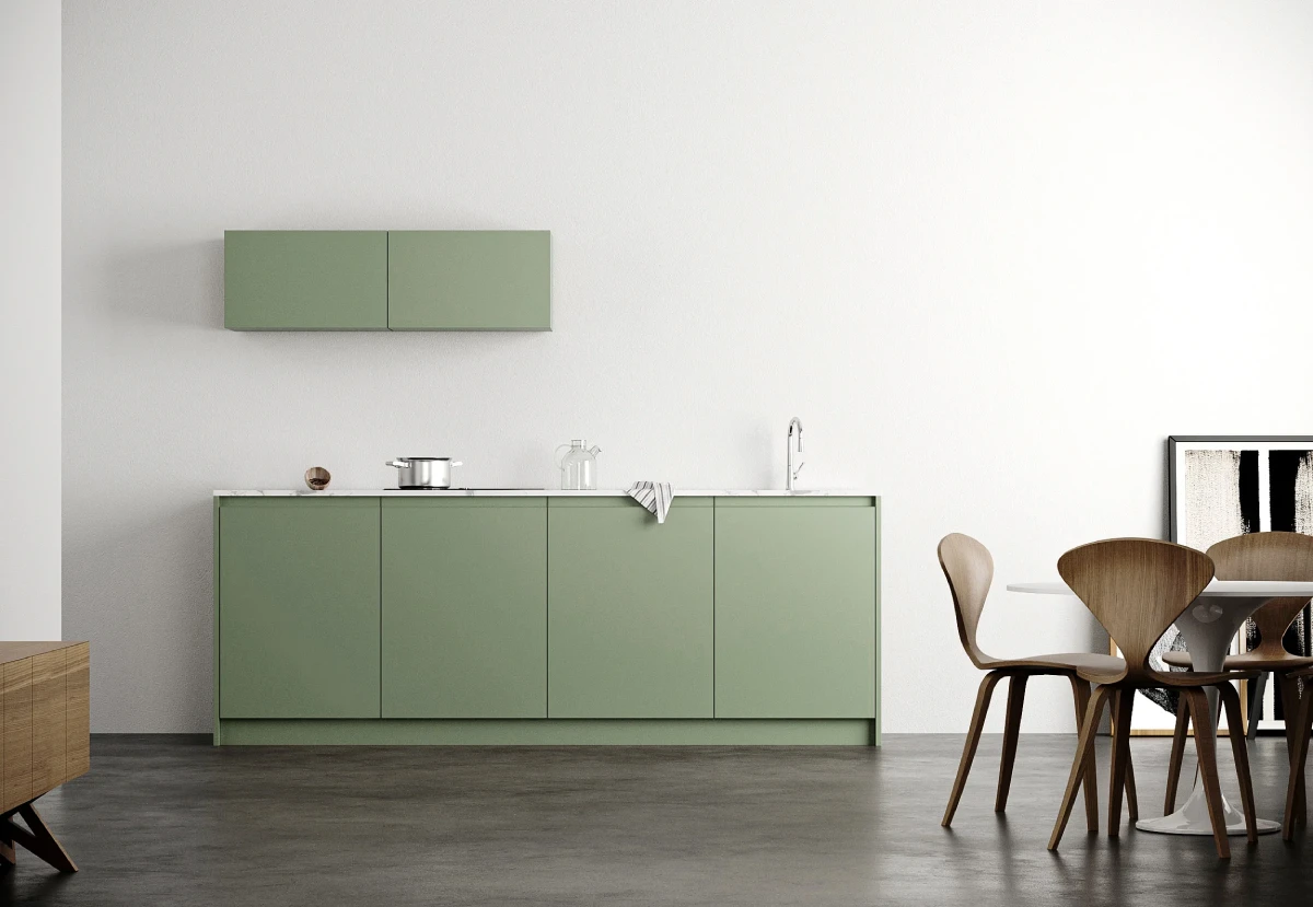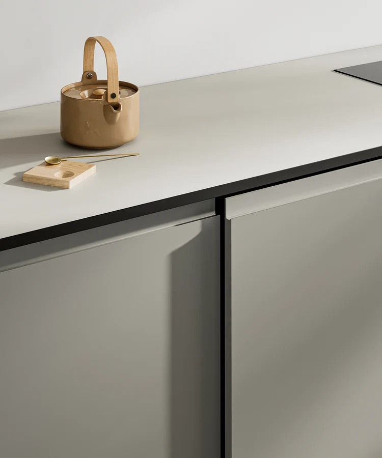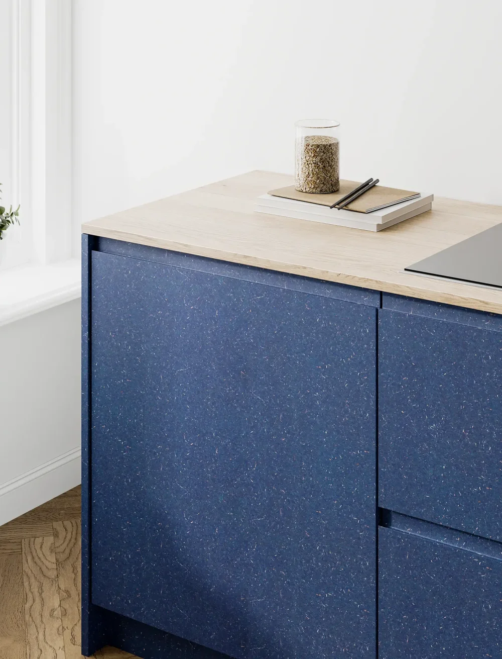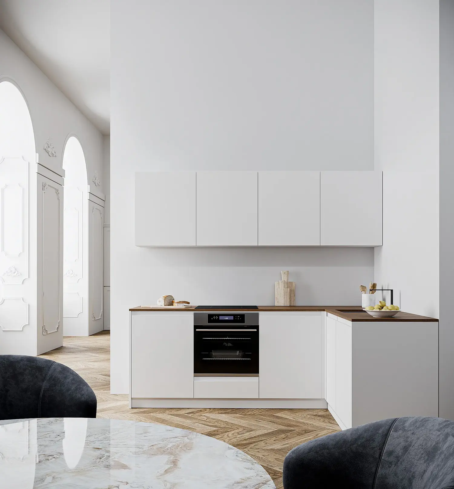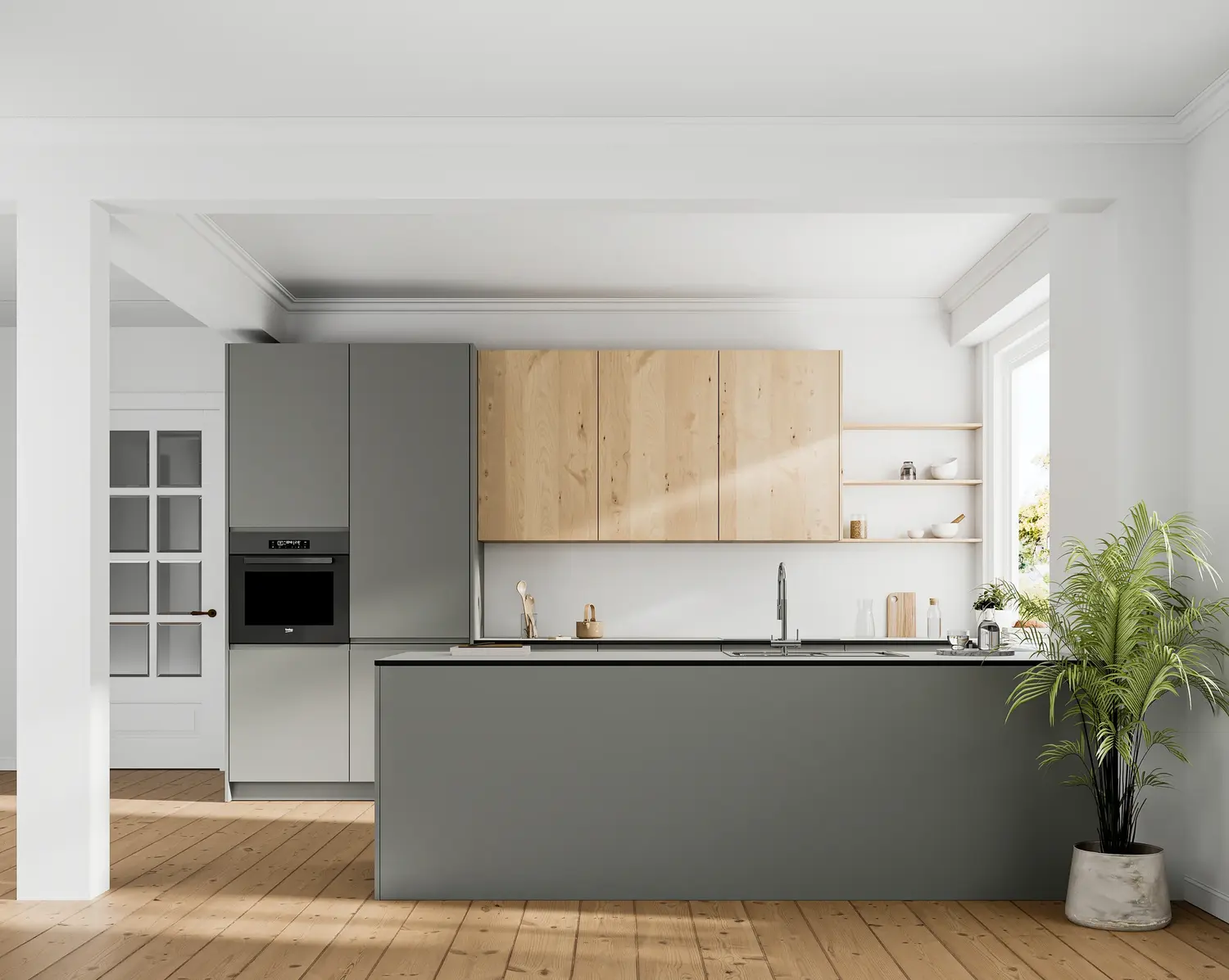 When creating Joy, the designers supported the trend of rational consumption and environmental friendliness. The meaningful shape of the facade with a milled handle does not require unnecessary attributes for opening, and the selected natural materials are made of recycled wood.