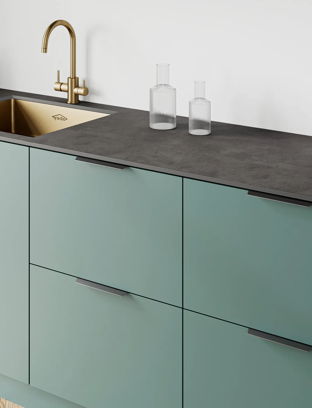 Pay attention to the shape of the handles and the position in which they can be fixed. If you are looking for a clean design with minimalistic accents, it is better to choose a Sheet or Blaze handle, which are installed on the end of the facade, as if it were an extension of it. Instead, an assortment of handles installed directly on the surface of the facade will create accents in the places of placement, forming a continuous composition of the kitchen. We recommend matching the color of the handles to other elements such as the sink or faucet, so that your kitchen is perceived as a single whole. If you are not tied to other kitchen accessories, the best choice is black matte or brushed handles, they always look stylish and will go well with any material from our range.
