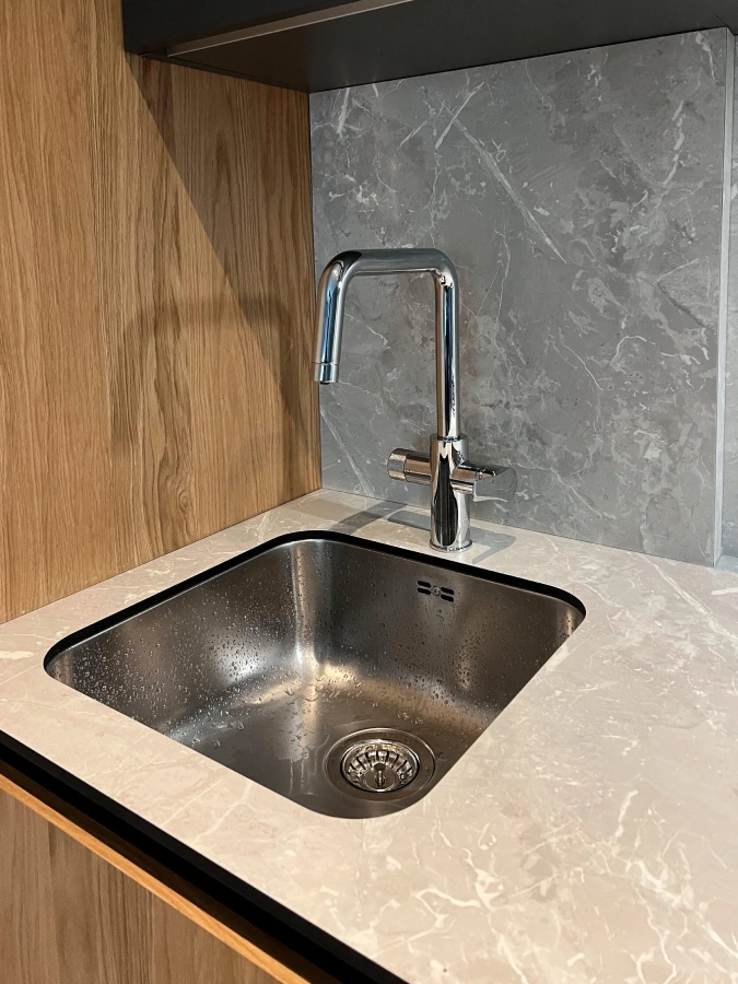 Design: Evolution Facade material: Wood natural oak and graphite Laminate Handle: Evolution black matte Table top: HPL Fittings: Blum Drawers: Blum Antaro white Body: White