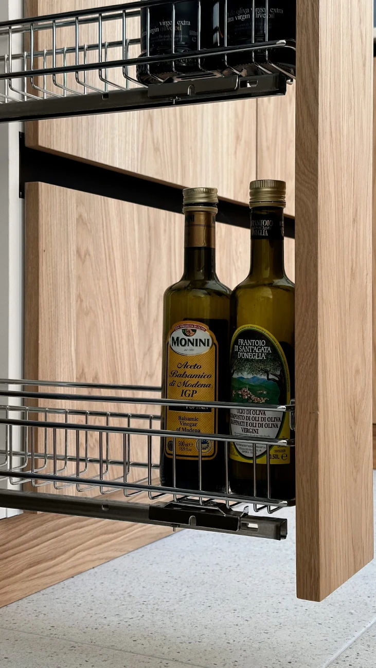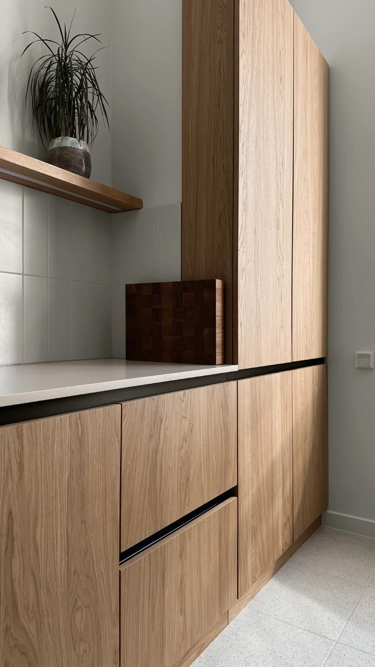 Design: Evolution Facade material: Wood natural oak and Authentic anechoic Handle: Evolution black matte Countertop: Quartz Fittings: Blum Drawers: Blum Antaro white Body: White