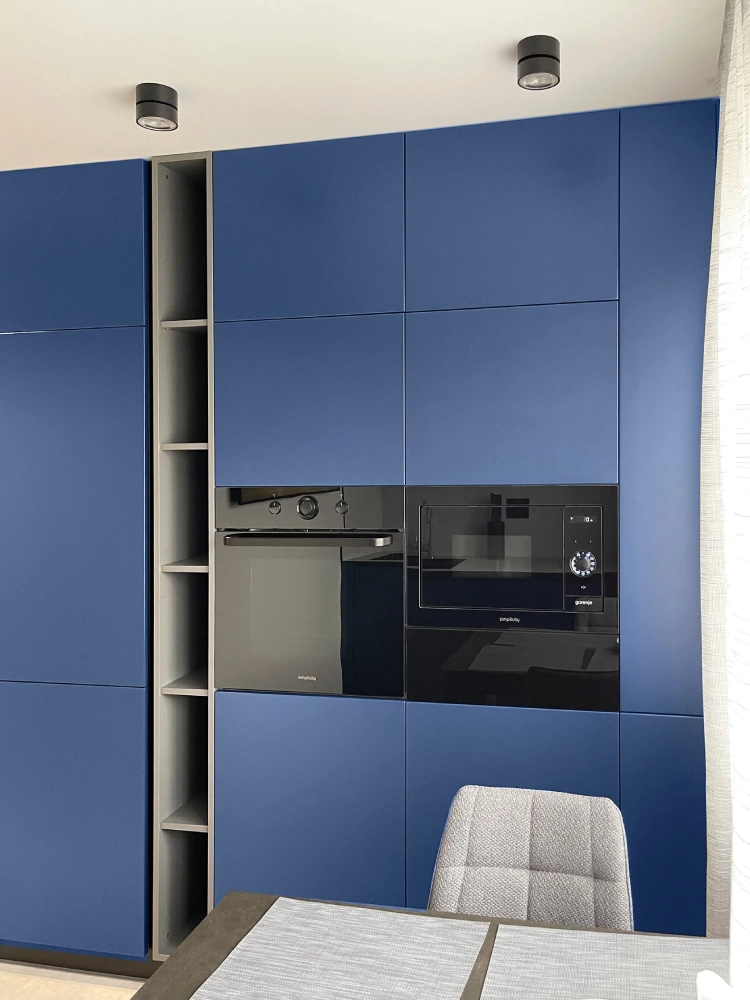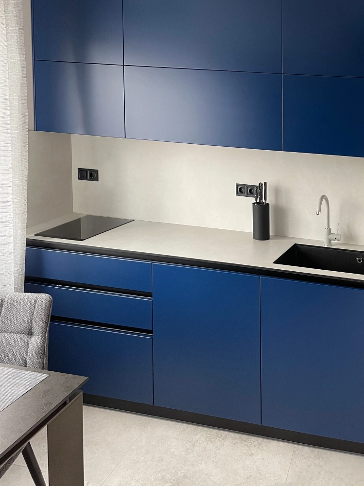 Design: Evolution Facade material: Color according to individual NCS color Handle: Black matte Table top: HPL Fittings: Blum Drawers: Blum Legrabox graphite Body: Graphite