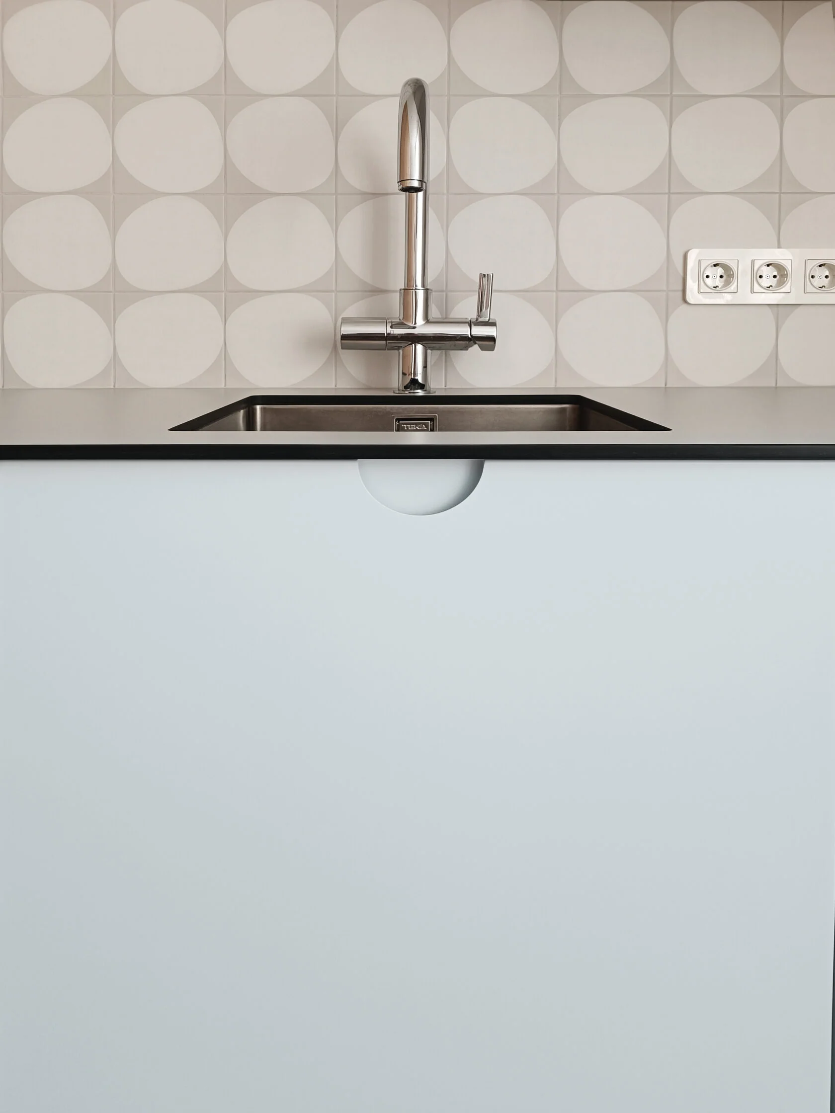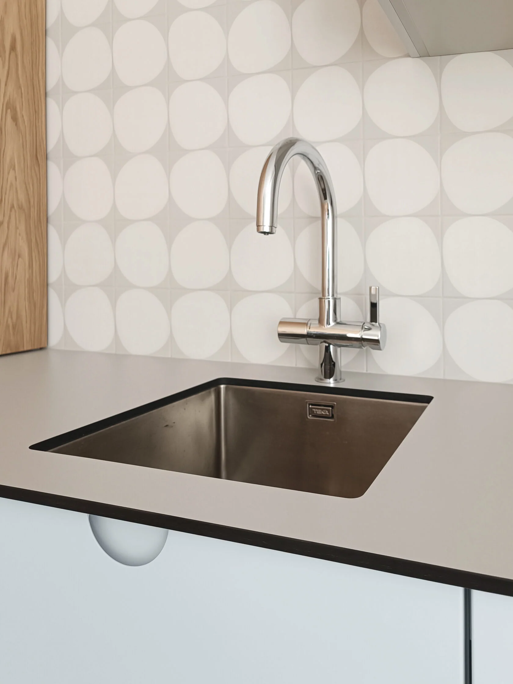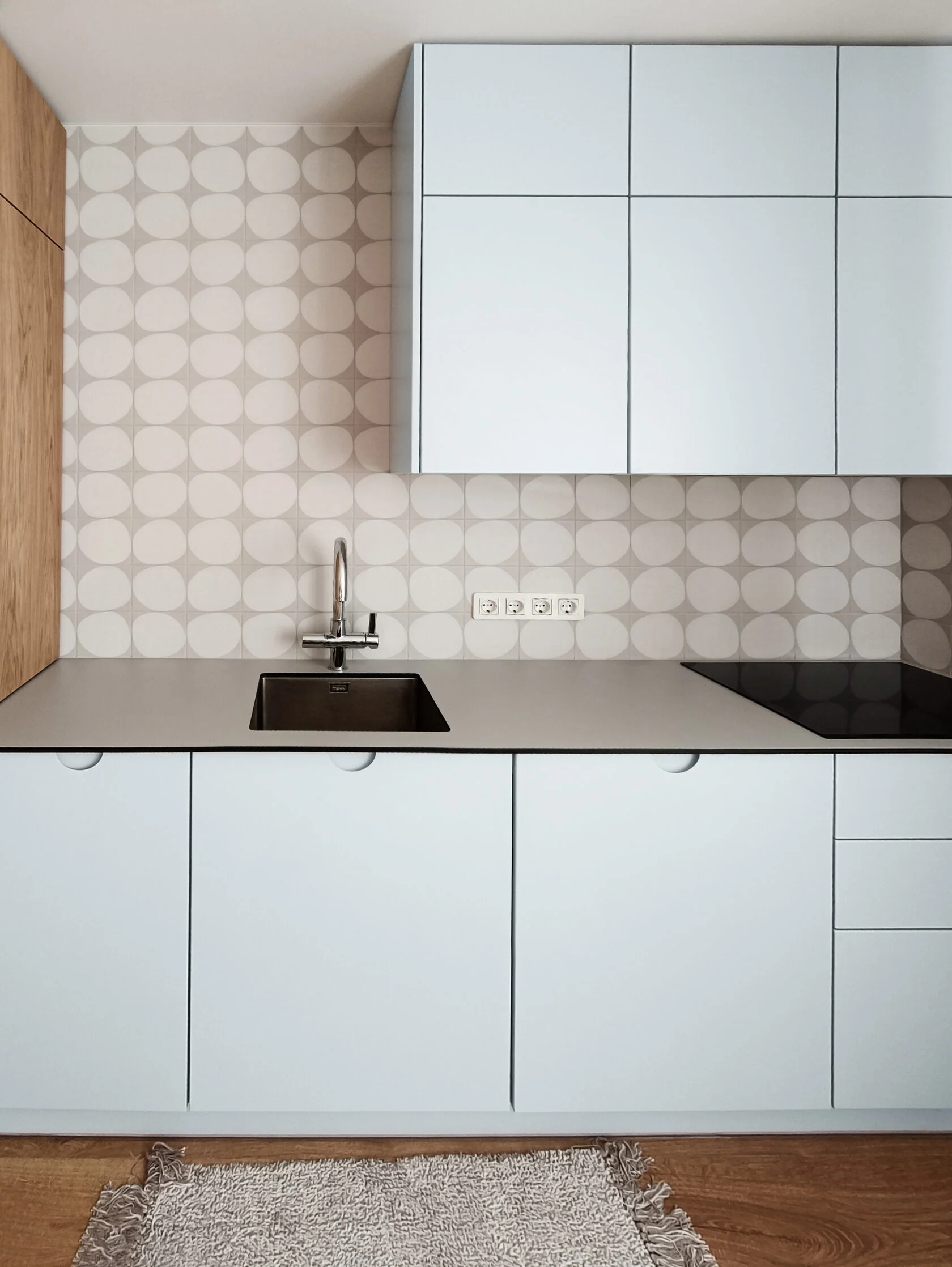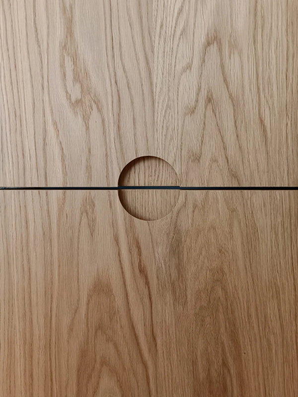 Design: Half Moon Material: Facades Color pale cornflower and Wood natural oak Handle: Color pale cornflower and Wood natural oak Table top: HPL Fittings: Blum Drawers: Blum Antaro white Body: White